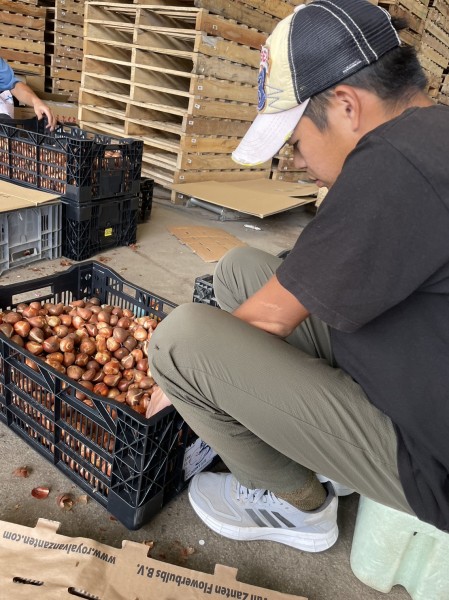 オランダから運ばれてきたチューリップの球根の集荷準備をしています。