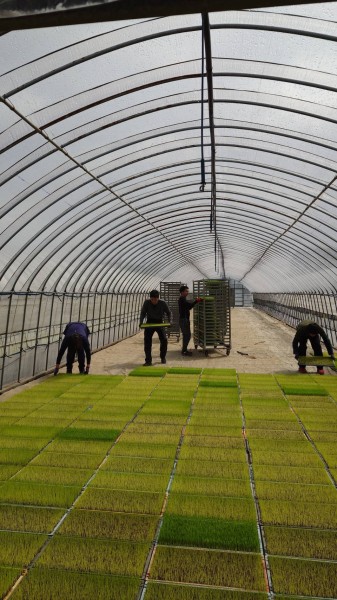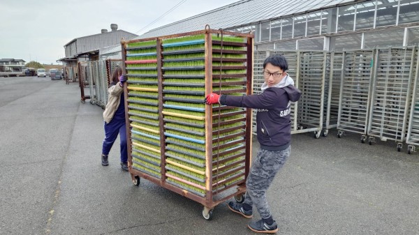 JA福岡京築様よりお仕事の依頼があり、本日お米の苗を広げる作業をさせて頂きました。何もない場所に苗を広げていくと、最後には緑の絨毯のようにとても綺麗で達成感と癒しを感じた一日でした。