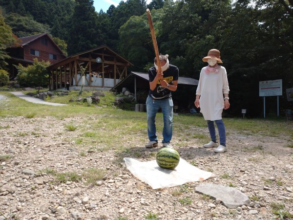 滝を見に行きマイナスイオンを感じ、それからキャンプ場へ行き、バーベキュー&川遊び&スイカ割りをしました。